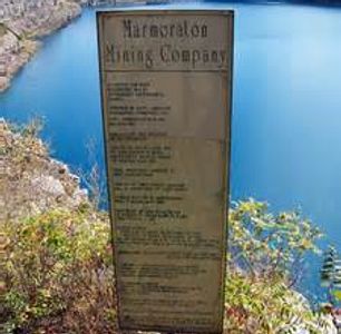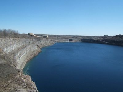 In 1953, before the Marmoraton could open, engineers first had to blast through 120 feet of limestone before reaching the high-grade ore, which was underneath. One blasted out, the open pit mine measured approximately 1700 feet by 1200 feet and reached 600 feet deep. Over time, underground streams and rainfall have slowly filled two thirds of the mine with water - so much so, that it is now officially classified as a lake.